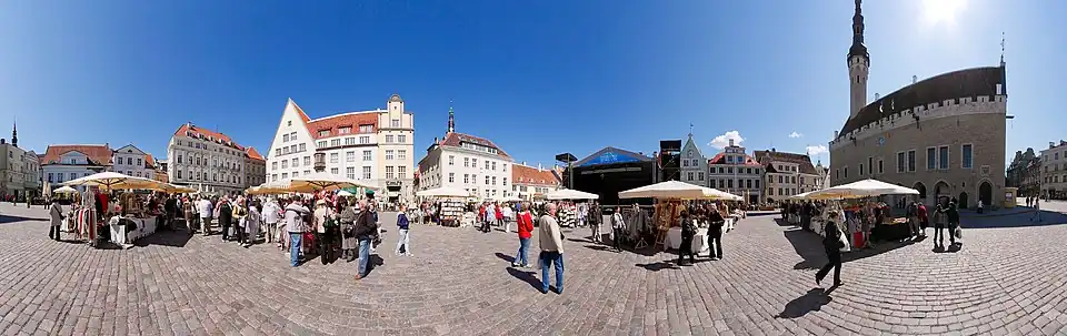 La place de l'Hôtel de ville est le vieux centre de Tallinn, où de nombreuses rues se rejoignent. La place, qui est bordée de beaux bâtiments médiévaux, a toujours été le centre de la vie sociale, l'endroit le plus fréquenté de la ville avec des étals de marché, des maisons et des piloris.
