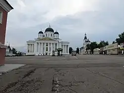 Auparavant, la place de la Cathédrale s'appelait la place Rouge. C'est le cœur de la ville ou sa porte d'entrée. Ivan le Terrible y fait construire en 1552 un fort[1]. Cette place est la principale de la ville et dès le début du XVIIIe siècle[2] un marché s'y tenait le lundi et le vendredi devant les murs du monastère Saint-Nicolas. L'église de la Source-de-Vie a été construite en 1794 et la cathédrale de la Résurrection qui domine la place et la ville a été terminée en 1842. C'est un exemple parfait d'architecture néoclassique d'inspiration grecque.