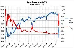↑ D'après J.-M. Vaslin, Le siècle d'or de la rente perpétuelle française, in «Le marché financier français au XIXesiècle», Vol. II - Aspects quantitatifs des acteurs et des instruments à la Bourse de Paris, Paris, Publications de la Sorbonne, 2006.