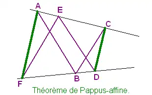- Axiome de Pappus affine : Si les points A, E, C sont alignés, si les points B, D, F sont alignés sur une autre droite, si (AB)//(DE) et si (BC)//(EF) alors (FA)//(CD).