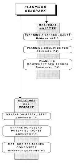 - Méthodes linéaire : planning à barres, planning chemin de Fer, planning en mouvement de terre, ...