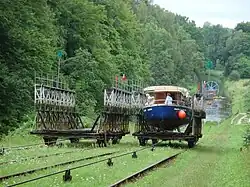 Sur ce canal, qui faisait à l'époque partie de la Prusse-Orientale, quatre plans inclinés furent d'abord construits entre 1844 et 1860, équilibrés hydrauliquement plutôt que par un contrepoids. En 1881, un cinquième plan incliné fut ajouté en remplacement d'écluses.