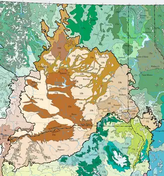 Les zones d'altitude sont couvertes du Fétuque d'Idaho, de l'Agropyre à épi et de pâturins. Les versants Nord sont couverts de Sapin de Douglas, de Pin ponderosa, de Symphoricarpos et Physocarpus. Les dépôts de lœss sont si fins qu'on n'y cultive que très peu. La région s'étend à l'est de l'Oregon et au nord de la forêt nationale d'Umatilla.