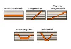En fonction de leur forme et de leur concordance avec la roche encaissante, les sills peuvent être classés en cinq types différents, en se basant sur les données recueillies sur le terrain[28],[29]. Il s'agit de sills concordants en strates, de sills transgressifs, de sills transgressifs en gradins, de sills en forme de soucoupe, de sills en forme de V et de sills hybrides[28],[29]. Les sills à strates concordantes sont la représentation classique d'un sill. Ils se développent tout du long en suivant la stratification de la roche encaissante et se trouvent souvent dans les parties les plus profondes de la croûte supérieure[29]. Des filons-couches transgressifs traversent et se propagent obliquement dans les couches supérieures par rapport à la roche encaissante, montrant des caractéristiques discordantes[29]. Les sills transgressifs par étapes sont similaires aux sills transgressifs, mais ils se caractérisent par une alternance de segments concordants et discordants, créant une forme en escalier[29]. Les appuis en forme de soucoupe ont un appui central concordant inférieur et deux appuis transgressifs extérieurs supérieurs qui s'aplatissent aux extrémités[29]. Ils ont généralement un sill intérieur plus épais et plus mince vers l'extérieur[29]. Les appuis en forme de V ressemblent quelque peu aux appuis en forme de soucoupe, mais ils ont une partie intérieure plus courte. Les sills hybrides présentent des caractéristiques mixtes des sills mentionnés ci-dessus[29].