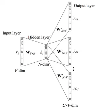 Dans les deux cas, on définit un réseau de neurones artificiels qui a une couche d'entrée , et une couche de sortie . Ces vecteurs sont binaires et de taille . Une couche cachée à dimensions est intercalée entre les deux. est un hyperparamètre d'apprentissage. L'entraînement du réseau produit une matrice de taille , connectée à gauche aux entrées et à droite à la couche cachée. Au terme de l'apprentissage, la matrice contient les plongements de tous les mots du vocabulaire.