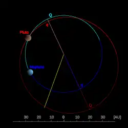 Le demi-grand axe de l'orbite de Pluton est de 39,88 ua[51], mais du fait de l'excentricité prononcée de cette orbite, la distance entre Pluton et le Soleil varie entre 29,7 ua au périhélie et 49,5 ua à l'aphélie, et l'année plutonienne dure 248,1 années terrestres[52].