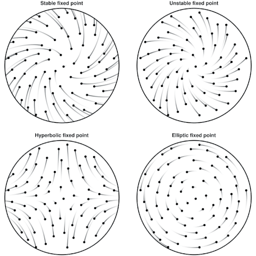 Un point d'équilibre est hyperbolique si aucune des valeurs propres n'a de partie réelle nulle. Si toutes les valeurs propres ont des parties réelles négatives, le point est stable . Si au moins une des parties réelles est positive, le point est instable . Si au moins une des valeurs propres a une partie réelle négative et au moins une a une partie réelle positive, l'équilibre est un point col et il est instable. Si toutes les valeurs propres sont réelles et ont le même signe, le point est appelé un nœud.
