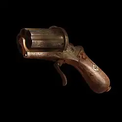 - ↑ En Amérique de Nord, le brevet de Samuel Colt de 1836 empêche ses concurrents de produire des revolvers jusqu'en 1857, ce qui explique en grande partie l'extraordinaire succès des pepper-box.