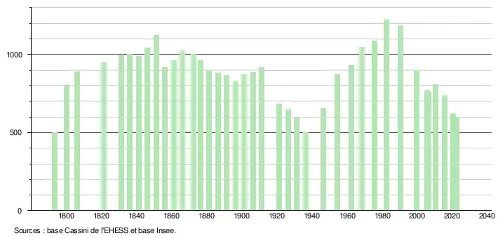 L'évolution du nombre d'habitants est connue à travers les recensements de la population effectués dans la commune depuis 1793. Pour les communes de moins de 10 000 habitants, une enquête de recensement portant sur toute la population est réalisée tous les cinq ans, les populations de référence des années intermédiaires étant quant à elles estimées par interpolation ou extrapolation[18]. Pour la commune, le premier recensement exhaustif entrant dans le cadre du nouveau dispositif a été réalisé en 2005[19].