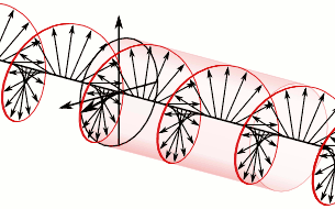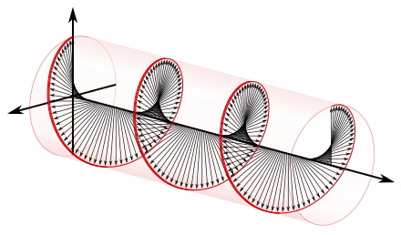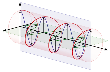 À droite se trouve une illustration des vecteurs champ électrique d’une onde électromagnétique polarisée circulairement. Le champ électrique de ces vecteurs a une norme constante, mais sa direction change selon un mouvement de rotation. Étant donné qu'il forme une onde plane, chaque vecteur représente la norme et la direction du champ électrique pour un plan entier qui est perpendiculaire à l’axe. deux images dans l’article sur les ondes planes pour mieux illustrer le concept.