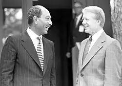 En 1978, Sadate signe avec Israël les accords de paix de Camp David, à la suite desquels il reçoit avec son homologue israélien le prix Nobel de la paix la même année[16]. Mais ce rapprochement coûte à l'Égypte un isolement inédit dans le monde arabe, alors que ses relations diplomatiques sont rompues avec cinq pays le jour du 5 décembre 1977 : la Libye de Mouammar Kadhafi, l'Algérie d'Houari Boumedienne, la Syrie d'Hafez al-Assad, l'Irak de Saddam Hussein, et le Yémen du Sud[15]. L'Égypte est exclue de la ligue arabe en 1979, qu'elle réintégrera en 1989[2].