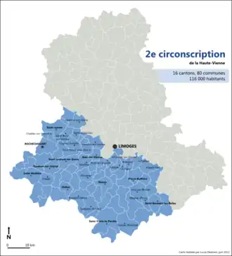 - 2e circonscription : cantons d'Aixe-sur-Vienne, Condat-sur-Vienne, Eymoutiers (10 communes), Limoges-2 (partie du quartier des Ruchoux), Limoges-6 (partie du quartier Emailleurs), Limoges-7 (quartiers Portes Ferrées et ZI Magré-Romanet), Limoges-8 (sauf quartier Hôtel de Ville et partie de Bellevue), Limoges-9 (quartier du Roussillon), Rochechouart, Saint-Junien et Saint-Yrieix-la-Perche