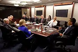 La notion de sécurité nationale trouve son origine aux États-Unis pendant la Deuxième Guerre mondiale et se trouve consacrée par le National Security Act de 1947[18]. Le rôle du NSC est de coordonner les politiques étrangères et de défense. Sa composition et son mode de fonctionnement évoluent avec les Présidents successifs. Le NSC se dote progressivement d'une structure permanente. Le Goldwater-Nichols Act de 1986 prévoit que le président soumette au Congrès chaque année un document dit de Stratégie de sécurité nationale[69],[70]. En pratique, de 1987 à 2017 dix-sept rapports ont été produits[71]. La stratégie de sécurité nationale est à intervalle très irrégulier complétée par un document de Stratégie de défense nationale produit sous la responsabilité du secrétaire à la Défense qui précise les capacités militaires nécessaires à son exécution[72] ou un document de Stratégie militaire nationale produit sous l'autorité du Comité des chefs d’état-major interarmées (Joint Chiefs of Staff - JCS) qui précise les plans opérationnels et d'urgence des armées[73].