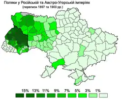 En raison de l'assimilation, alors même qu'au moment du troisième partage en 1795, 10 % de la population était polonaise[11], et malgré la migration continue de Polonais du centre de la Pologne vers les terres ukrainiennes[6], seuls 3 % de la population totale de ces territoires déclaraient encore à la fin du XIXe siècle que le polonais était leur première langue[11].