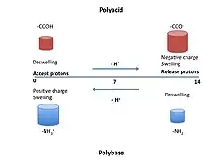Souvent, la réponse à différentes valeurs de pH est un gonflement ou une contraction. Par exemple, les polymères anioniques libèrent des protons pour devenir chargés négativement à pH élevé. Puisque les chaînes de polymères sont souvent à proximité d'autres parties de la même chaîne ou d'autres chaînes, les parties chargées identiquement se repoussent les unes les autres. Cette répulsion conduit à un gonflement du polymère.