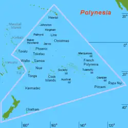 Traditionnellement[7], la Polynésie est délimitée par le triangle formé par Hawaii, la Nouvelle-Zélande et l'île de Pâques, appelé le « triangle polynésien ». Les îles Samoa et Tonga et la Polynésie française constituent les autres principaux groupes d'îles. Les Kiribati, dont l'archipel le plus occidental (gilbertin) est micronésien, fait tout de même partie de la Polynésie par la plus grande partie de son étendue (notamment maritime : îles de la Ligne).