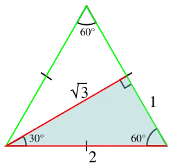 Lorsque l'on apprend la trigonométrie, on constate vite que le cosinus et le sinus des mesures de certains angles ont une forme particulière, qui fait intervenir des racines carrées. Ainsi, pour un angle de mesure 30 degrés, soit π/6 radians, le théorème de Pythagore permet de démontrer que :