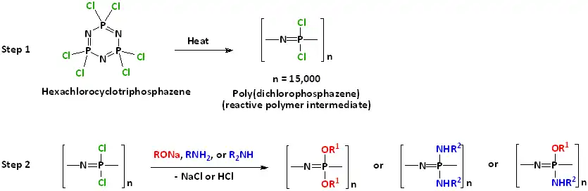 Le mode de synthèse dépend du type de polyphosphazène considéré. La méthode la plus employée pour produire des polymères linéaires repose sur un procédé en deux étapes. La première étape consiste à chauffer, à environ 250 °C dans un système fermé, une petite molécule de phosphazène cyclique appelée hexachlorocyclotriphosphazène, ou plus simplement hexachlorophosphazène, et de formule (NPCl2)3 : cela conduit à polymériser ce composé pour former une longue chaîne linéaire de poly(dichlorophosphazène) (NPCl2)n d'au moins 15 000 unités. La seconde étape du procédé consiste à substituer les atomes de chlore de cette chaîne par des groupes organiques à l'aide de réactions faisant intervenir des alcoolates, des phénols, des amines ou des organométalliques. Comme on peut utiliser un grand nombre de réactifs différents selon différentes combinaisons, il est possible de produire une grande variété de structures présentant des propriétés différentes. Il est également possible de faire intervenir des réactions de condensation pour obtenir le poly(dichlorophosphazène) intermédiaire[4].