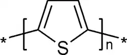 Unité de répétition monomère de polythiophène non substitué. Les étoiles indiquent les groupes de terminaison de la chaîne polymère.
