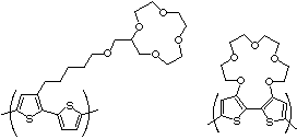 L'utilisation de PT comme capteurs répondant à une analyte a aussi été le sujet d'une recherche intense. En plus des applications de capteurs biologiques, les PT peuvent être aussi fonctionnalisés avec des récepteurs de synthèse pour détecter des ions métalliques ou aussi bien que des molécules chirales. Les PT avec chaînes latérales[78] ou principales[28] formant des éthers couronnes ont été signalés en 1993 par les équipes de recherche de Bäuerle et Swager, respectivement (figure 8). Des couches minces électrochimiquement polymérisées du PT avec éther couronne latéral de Bäuerle ont été exposés à des concentrations millimolaires de cations alcalins (Li, Na et K). Le courant passant au travers du film à potentiel fixe chute drastiquement dans les solutions d'ions lithium, beaucoup moins pour les solutions d'ions sodium et faiblement pour les solutions d'ions potassium. Les PT avec éthers couronnes en chaînes principales de Swager ont été préparés par couplage chimique et caractérisés par spectroscopie d'absorption. L'addition des mêmes cations alcalins conduit à des décalages d'absorption de 46 nm (Li), 91 nm (Na) et 22 nm (K). L'amplitude des déplacements correspond aux affinités de liaison ionique des éthers couronnes correspondants, résultant d'une torsion de la chaîne polymère conjuguée induite par la liaison ionique.