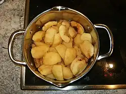 Au cas où on la cuit entière, afin d'éviter que la pomme n'éclate avec la chaleur, il faut l'inciser ou la piquer[36],[37]. Précaution inutile pour la cuisson de pommes coupées en deux, en quartier, en tranches, lamelles, etc.