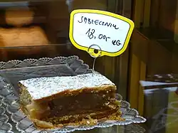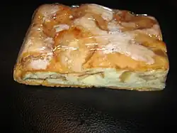 L'Apfelstrudel, strudel aux pommes: pâte à strudel feuilletée fourré de gros morceaux de pommes, de noix d'amande, et de raisins secs. Se sert chaud aromatisé de cannelle et de crème fraîche[70]. Il existe diverses pâtes à strudel, souvent on utilise de la pâte feuilletée, mais la véritable qui donne le ausgezogener Apfelstrudel, Apfelstrudel effiloché, est très finement feuilletée, comme la pâte phyllo (du grec ancien φύλλον / phýllon, feuille) des baklavas ottomanes d'où elle tient son origine[71]. Le baklava aux pommes se rencontre en Afrique du Nord[72].