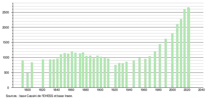 L'évolution du nombre d'habitants est connue à travers les recensements de la population effectués dans la commune depuis 1793. Pour les communes de moins de 10 000 habitants, une enquête de recensement portant sur toute la population est réalisée tous les cinq ans, les populations de référence des années intermédiaires étant quant à elles estimées par interpolation ou extrapolation[18]. Pour la commune, le premier recensement exhaustif entrant dans le cadre du nouveau dispositif a été réalisé en 2006[19].