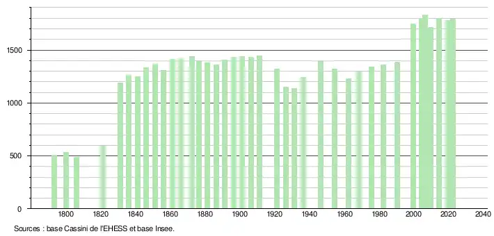L'évolution du nombre d'habitants est connue à travers les recensements de la population effectués dans la commune depuis 1793. Pour les communes de moins de 10 000 habitants, une enquête de recensement portant sur toute la population est réalisée tous les cinq ans, les populations de référence des années intermédiaires étant quant à elles estimées par interpolation ou extrapolation[16]. Pour la commune, le premier recensement exhaustif entrant dans le cadre du nouveau dispositif a été réalisé en 2004[17].