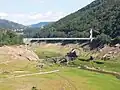 Le pont suspendu en service et l'ancien en juillet 2014 lors de la vidange du réservoir du barrage de Sarrans. | ||||
