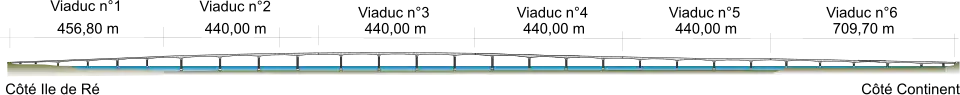 Le pont de l'Île de Ré est constitué de six viaducs distincts reliés entre eux par des joints de chaussée. L'ensemble de l'ouvrage présente un rayon de courbure horizontale de 5 000 mètres.