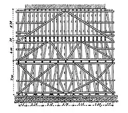 Il y a trois étages de pièces équarries : l’étage supérieur a vingt-et-une fermes reposant sur une ligne de coins qui servent à régler la hauteur des fermes, puis à décintrer. Les deux autres étages n’ont que onze fermes. Les palées de l’étage inférieur reposent sur des plateformes en maçonnerie de ciment de 20 m de longueur En trois mois, on a approvisionné le bois et construit le cintre avec 40 charpentiers, puis il a été monté en 14 semaines[S 2].