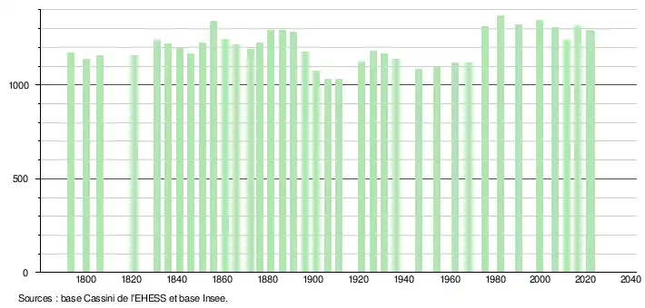 L'évolution du nombre d'habitants est connue à travers les recensements de la population effectués dans la commune depuis 1793. Pour les communes de moins de 10 000 habitants, une enquête de recensement portant sur toute la population est réalisée tous les cinq ans, les populations de référence des années intermédiaires étant quant à elles estimées par interpolation ou extrapolation[17]. Pour la commune, le premier recensement exhaustif entrant dans le cadre du nouveau dispositif a été réalisé en 2006[18].