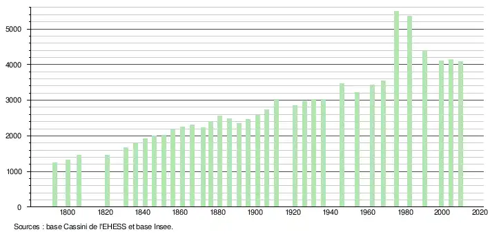 L'évolution du nombre d'habitants est connue à travers les recensements de la population effectués dans la commune depuis 1793. À partir du , les populations légales des communes sont publiées annuellement dans le cadre d'un recensement qui repose désormais sur une collecte d'information annuelle, concernant successivement tous les territoires communaux au cours d'une période de cinq ans. Pour les communes de moins de 10 000 habitants, une enquête de recensement portant sur toute la population est réalisée tous les cinq ans, les populations légales des années intermédiaires étant quant à elles estimées par interpolation ou extrapolation[18]. Pour la commune, le premier recensement exhaustif entrant dans le cadre du nouveau dispositif a été réalisé en 2004[19],[Note 3].