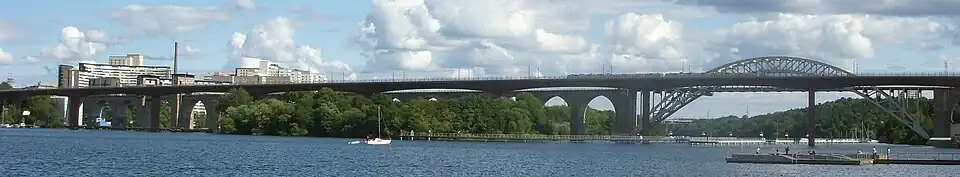 Le pont Ouest (au premier plan) et le pont Est, vus de la rive sud de la baie d'Årsta en août 2008.
