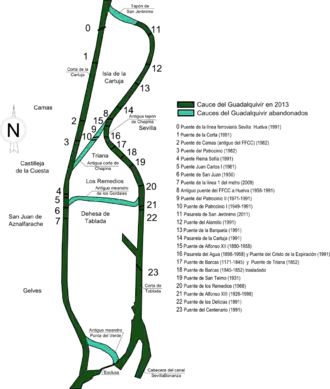 Séville, ville d'Andalousie (Espagne), est traversée du nord au sud par deux cours d'eau : le Guadalquivir et sa darse, également appelée canal Alphonse-XIII. De nombreux ponts les traversent.