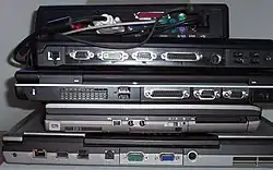 - ports externes permettant de communiquer avec différents périphériques, souvent via un câble, quoiqu'on trouve aussi notamment dans le cas des portables des connecteurs d'extension reliés à un bus (par exemple PC-Card).