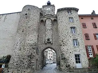 Porte autrefois fortifiée de l'entrée principale de la première enceinte du château d'Allègre, la porte Monsieur est entourée de deux tours. Elle a été érigée entre 1365 et 1435, présentant un arc en ogive surmonté de créneaux défensifs et a été agrémentée, au cours du XIXe siècle, d'une horloge publique[1].