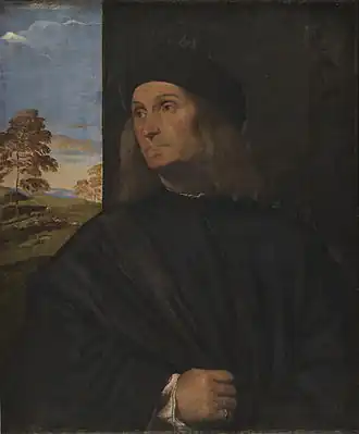 Certains ont émis l'hypothèse que l'homme, dont le visage se tourne vers un partenaire invisible, pourrait être Giovanni Bellini. Innovante, dans le respect de la tradition, est la posture du corps et du regard, face à des directions opposées. À partir de la fenêtre à gauche, élément typique de l'art du portrait vénitien, on peut voir un paysage rural lumineux.