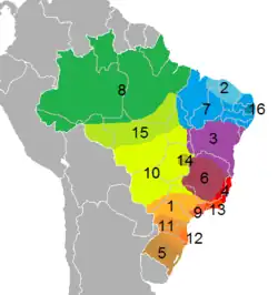 Les tentatives de classification des dialectes du Brésil sont peu nombreuses et la plus importante a été faite en 1922 (et revue en 1953) par le philologue Antenor Nascentes[71]: