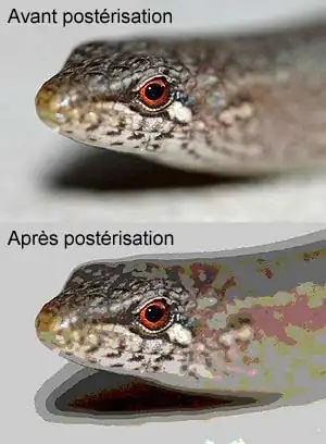La postérisation apparaît lorsque, dans une image, une gradation continue est remplacée par un nombre plus réduit de couleurs. Cela donne lieu à des coupures abruptes de couleurs, comme sur un vieux poster.