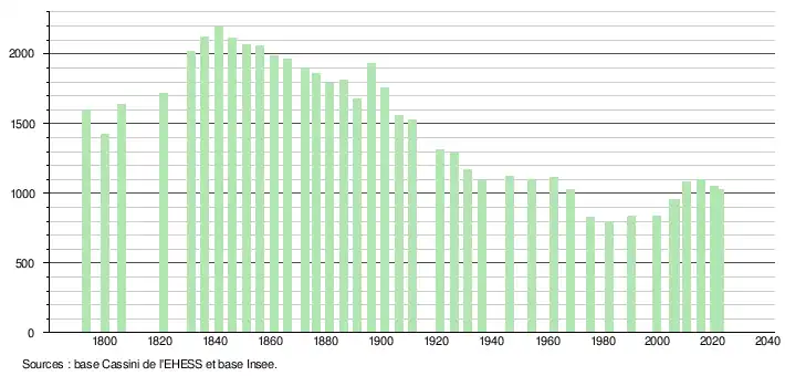 L'évolution du nombre d'habitants est connue à travers les recensements de la population effectués dans la commune depuis 1793. Pour les communes de moins de 10 000 habitants, une enquête de recensement portant sur toute la population est réalisée tous les cinq ans, les populations de référence des années intermédiaires étant quant à elles estimées par interpolation ou extrapolation[15]. Pour la commune, le premier recensement exhaustif entrant dans le cadre du nouveau dispositif a été réalisé en 2005[16].