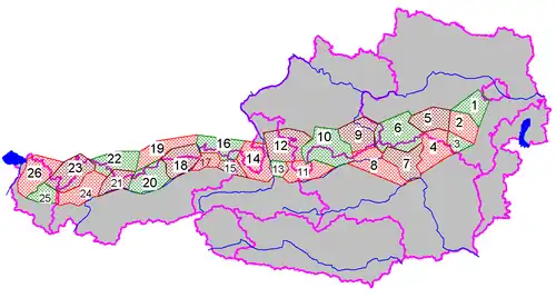 Cette subdivision est basée sur la division des Alpes en deux parties, Alpes occidentales et Alpes orientales, dans la littérature germanophone. La distinction s'oriente sur les différences géologiques et géomorphologiques exposées le long de la frontière entre l'Autriche et la Suisse au Rhin alpin et via le col du Splügen vers le sud jusqu'au lac de Côme. Le principe est répandu en particulier par la classification orographique des Alpes orientales développée par les clubs alpins allemand, autrichien et sud-tyrolien (Alpenvereinseinteilung der Ostalpen, AVE).