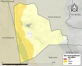 Le retrait-gonflement des sols argileux est susceptible d'engendrer des dommages importants aux bâtiments en cas d’alternance de périodes de sécheresse et de pluie. 35,3 % de la superficie communale est en aléa moyen ou fort (44,5 % au niveau départemental et 48,5 % au niveau national). Sur les 123 bâtiments dénombrés sur la commune en 2019, 19 sont en aléa moyen ou fort, soit 15 %, à comparer aux 75 % au niveau départemental et 54 % au niveau national. Une cartographie de l'exposition du territoire national au retrait gonflement des sols argileux est disponible sur le site du BRGM[37],[Carte 3].