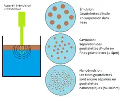 Il est possible de mélanger des liquides non miscibles, par exemple de l’huile et de l’eau, en utilisant les ultrasons pour éviter l'ajout d'un tensioactif. Premièrement, en conservant l’exemple de l’huile et de l’eau, on utilise une basse fréquence précise utile pour commencer l’émulsion: le passage de l’huile en gouttelettes dans l’eau. En changeant la fréquence, on peut alors faire subir une cavitation acoustique aux gouttelettes d’huile, ce qui va les séparer en plusieurs fines gouttelettes. Deuxièmement, en utilisant une haute fréquence, il est possible de faire une nanoémulsion des fines gouttelettes en gouttelettes de taille de l’ordre du nanomètre. Cette technique est utilisée, entre autres, dans la synthèse du biodiesel dans laquelle de l’huile végétale est transférée dans un alcool (méthanol ou éthanol) par émulsion.