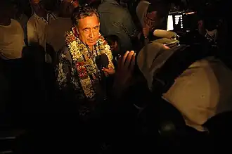 Il se rend également à New York, notamment pour obtenir le soutien du mouvement des non-alignés le [24]. Le projet de résolution demandant la réinscription est déposé au secrétariat des Nations unies le [25], sous le parrainage des îles Salomon, Nauru et Tuvalu, mais est ensuite remanié en en faisant disparaître du texte la mention à la réinscription sur la liste des territoires non autonomes ainsi que la nécessité pour la France de contractualiser avec la Polynésie française un processus d'autodétermination par un accord. Ces deux dispositions enlevées, la nouvelle version se contente de prier « le Gouvernement français d’intensifier son dialogue avec la Polynésie française afin de faciliter et d’accélérer la mise en place d’un processus équitable et effectif d’autodétermination »[26]. Et alors que le vote du texte devait avoir lieu le , il n'est pas inscrit pour cette date à l'ordre du jour et est repoussé à une date indéterminée[27].