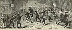 La politique étrangère s'imposa également comme un facteur de division. La plupart des Américains étaient favorables à la Révolution française avant l'exécution de Louis XVI, mais les partisans d'Hamilton commencèrent à s'interroger sur la tournure radicale des événements et la recrudescence des violences en France. Washington lui-même redoutait une déclaration de guerre de la Grande-Bretagne et ne voulait pas que le sentiment de sympathie à l'égard des Français ne propulsassent les États-Unis dans le conflit aux côtés de la France, au risque d'affecter considérablement l'économie américaine[66]. En 1793, alors que Londres rejoignait la coalition contre la France, des sociétés républicaines-démocrates naquirent dans plusieurs villes de l'Est, surtout parmi les citoyens de la classe moyenne, pour protester contre la politique économique d'Hamilton et défendre la cause des révolutionnaires français. Nombre de conservateurs considéraient ces structures comme populistes et dangereuses pour l'organisation de la société. La même année, les Britanniques lancèrent des attaques sur des navires américains faisant du commerce avec la France, suscitant une vague de sentiment anglophobe au sein de la population. Le président, qui s'efforçait de maintenir des relations pacifiques avec la Grande-Bretagne, ne fut pas épargné par les critiques[67].