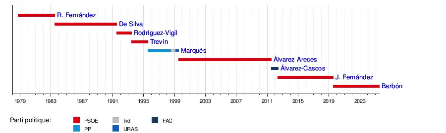 Depuis les premières élections régionales, le , huit personnalités ont exercé cette fonction, dont six issues du Parti socialiste ouvrier espagnol (PSOE). Le socialiste Vicente Álvarez Areces détient le record de longévité, avec trois mandats complets, tandis que le conservateur régional Francisco Álvarez-Cascos détient celui de la brièveté, avec à peine dix mois d'exercice.