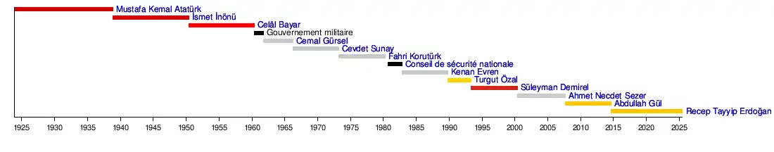 | 7 | ![]() | Kenan Evren ( - ) | 1982 | 1989 | Indépendant | Instigateur du coup d'État du 12 septembre 1980, il mène une politique répressive et fait arrêter des centaines de milliers de personnes dont des dizaines sont exécutées ou tuées sous la torture. Malgré cela il mène une retraite paisible après avoir quitté le pouvoir, jusqu'à sa condamnation à la prison à vie en 2014. |