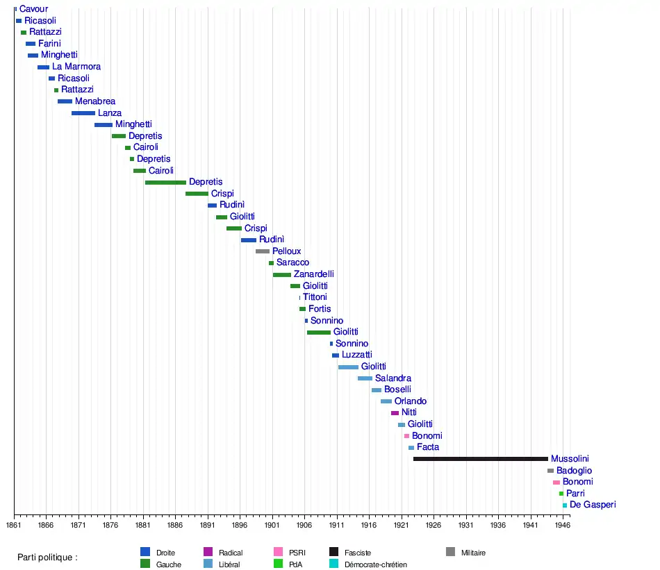 214 jours | Gauche historique | Depretis III | Gauche | [18] | |||
