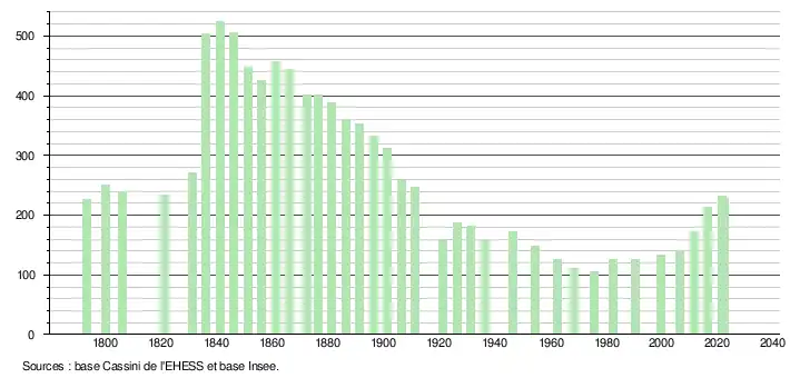 L'évolution du nombre d'habitants est connue à travers les recensements de la population effectués dans la commune depuis 1793. Pour les communes de moins de 10 000 habitants, une enquête de recensement portant sur toute la population est réalisée tous les cinq ans, les populations de référence des années intermédiaires étant quant à elles estimées par interpolation ou extrapolation[21]. Pour la commune, le premier recensement exhaustif entrant dans le cadre du nouveau dispositif a été réalisé en 2006[22].